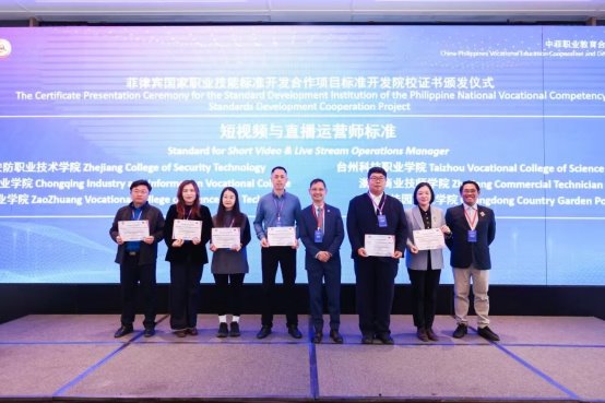 该项目由菲律宾职业技术教育与技能发展署(TESDA)和中菲丝路学院基金会联合发起,我校作为牵头单位,协同枣庄科技职业学院、重庆工信职业学院、台州科技职业学院、浙江商业技师学院、广东碧桂园职业学院共同完成,北京博导前程信息技术股份有限公司提供了有力的组织保障服务。项目组专家充分借鉴国家人社部发布的职业技能标准要求,并结合菲律宾产业发展、教育学情及企业需求,形成了具有科学性、规范性、实用性、适应性的短视频与直播运营师职业技能标准。