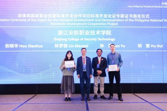 该项目的完成标志着数字商贸学院在国际化办学上的更进一步,同时也为建设国际化教师团队和提升学校国际影响力奠定良好基础。学校教务处(双高建设办公室)处长侯晓华、数字商贸学院林梦茜、孙昱、胡慧四位教师获得菲律宾职业技术教育与技能发展署(TESDA)颁发的项目标准开发专家认证。