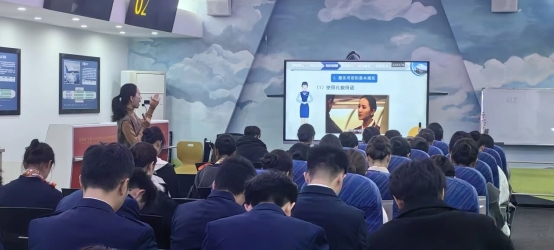 11月25日下午,校级示范课《服务礼仪》率先在昌期楼101教室开讲。张亚亚老师以“服务用语规范”等内容为核心,通过视频演示、角色扮演等方式,强化学生的岗位技能认知。张亚亚老师以深厚的专业知识和丰富的教学经验,结合案例与互动,不仅详细拆解鞠躬角度、握手力度、眼神交流等具体规范,还创新性的将AI人工智能技术融入课堂设计为课堂注入全新的活力,邀请同学们使用AI人工软件生成高度仿真的对话场景,让同学们化身“乘务员”沉浸式体验职场场景沟通,同学们纷纷积极思考、踊跃发言。此外,民航服务类课程还依托特色实训场地,课堂氛围轻松且富有引导性。